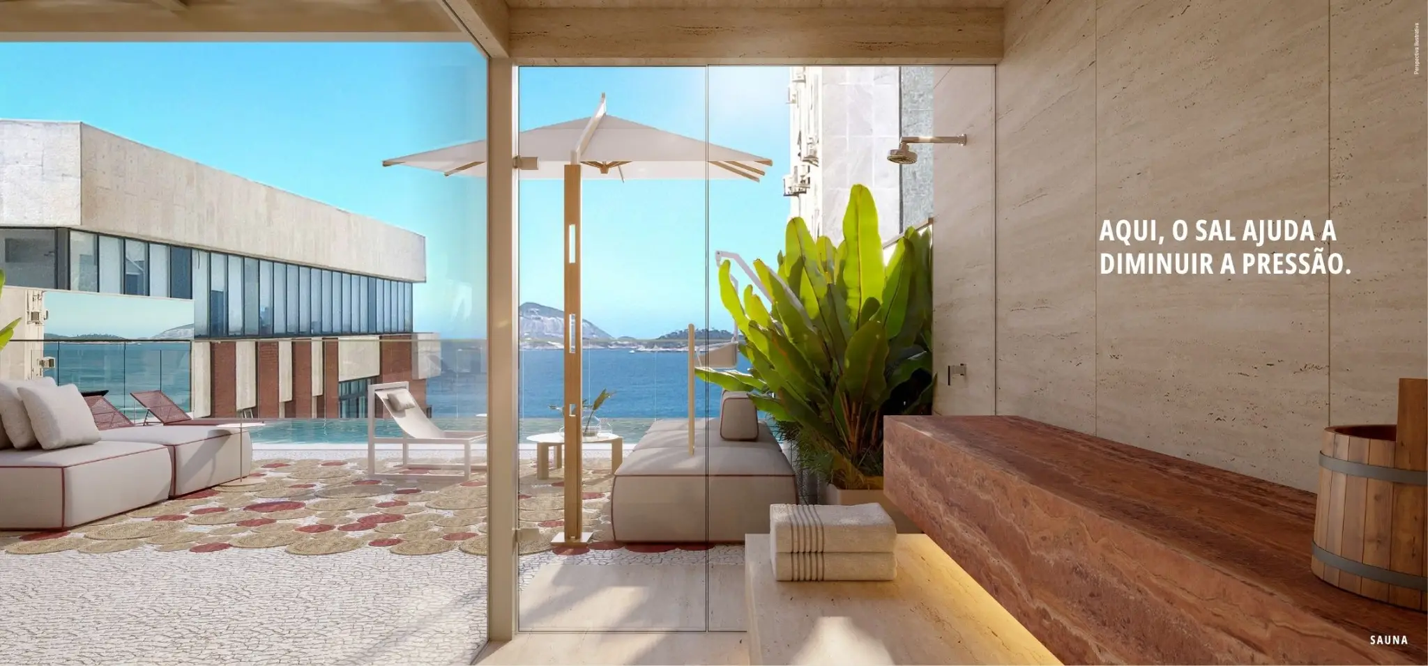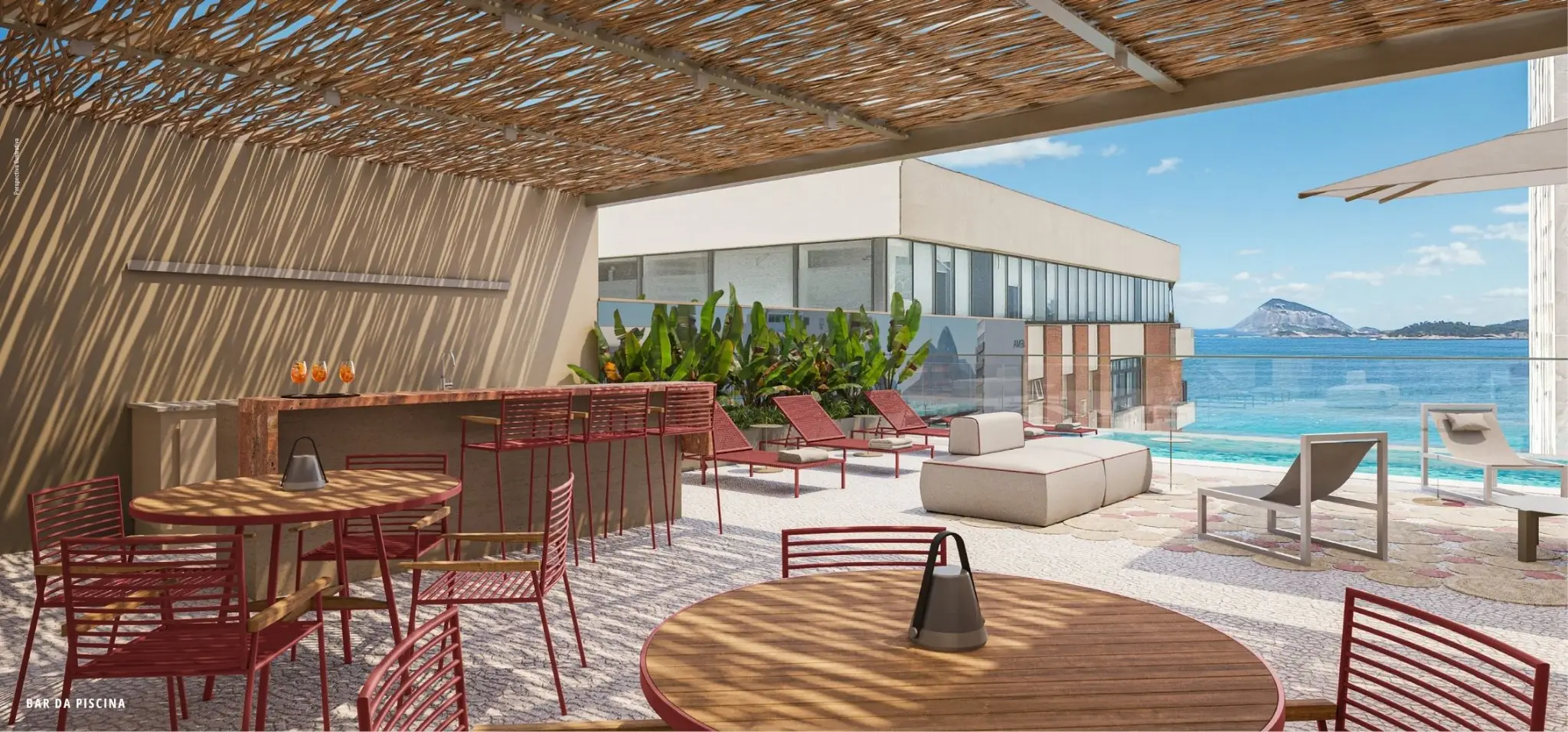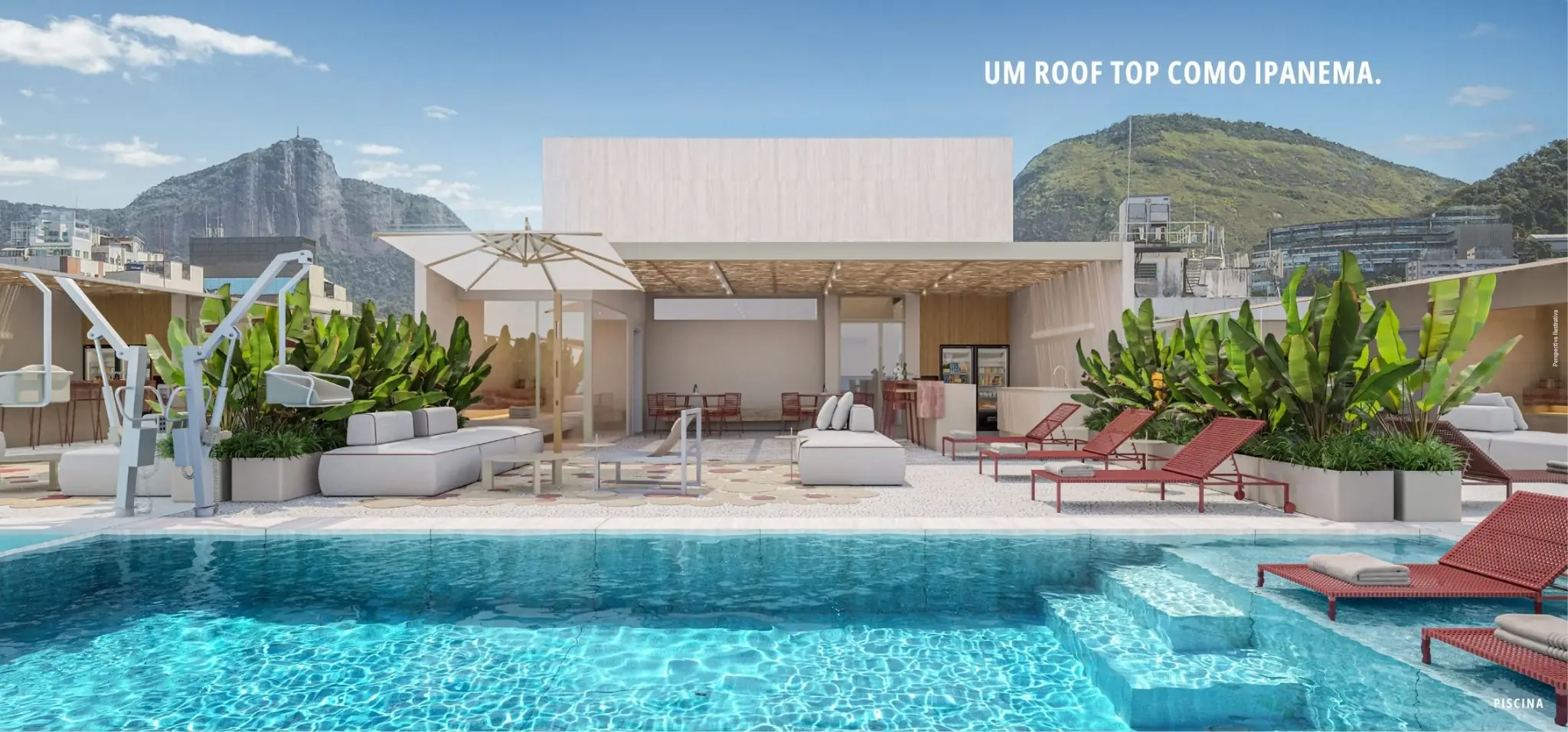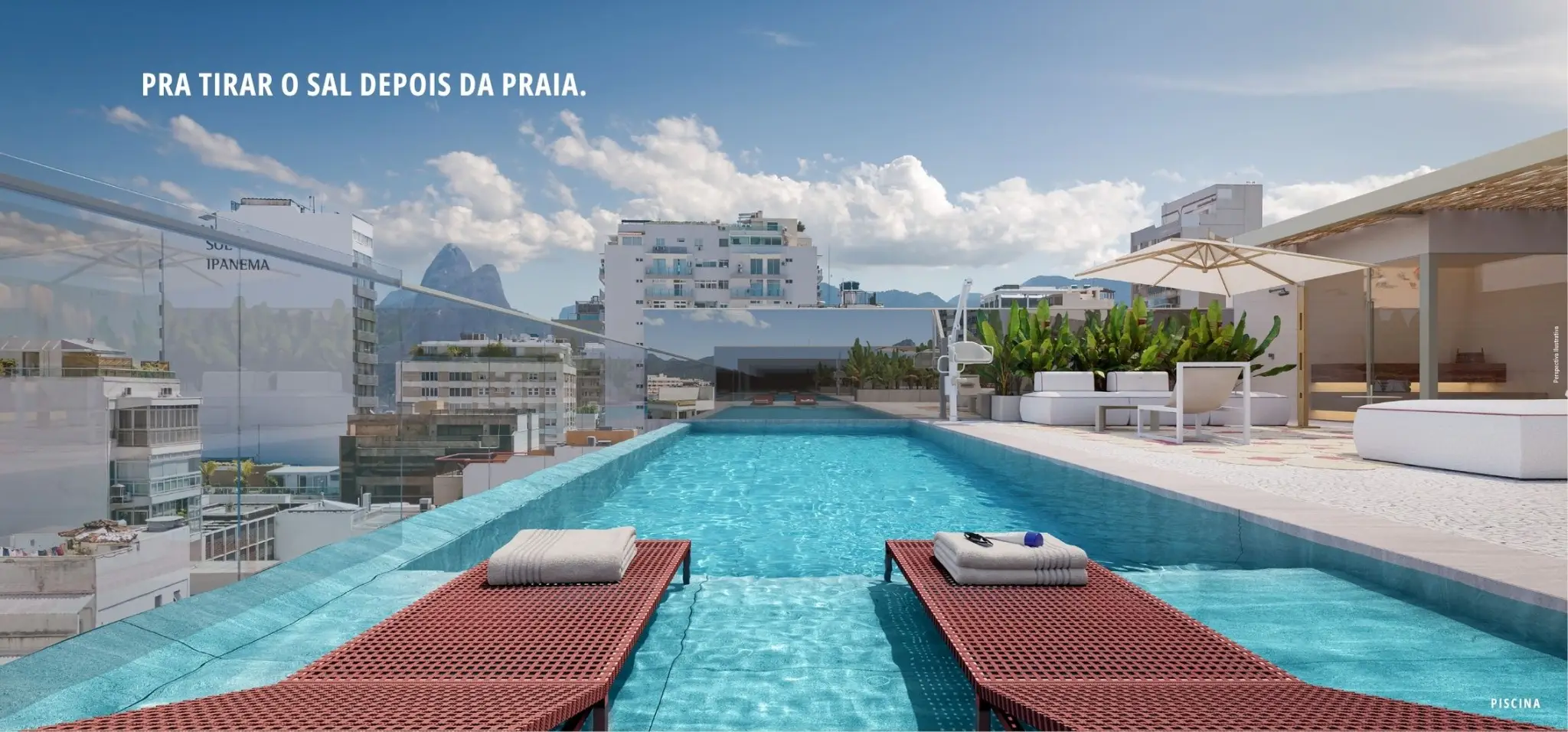 O Sal Praia de Ipanema traz fachada ativa ligada à Prudente de Morais, materiais inspirados nas cores naturais da praia e ambientes pensados para uso real. Além disso, o rooftop abre para o horizonte, com piscina e solarium que mantêm a vista clássica do bairro.