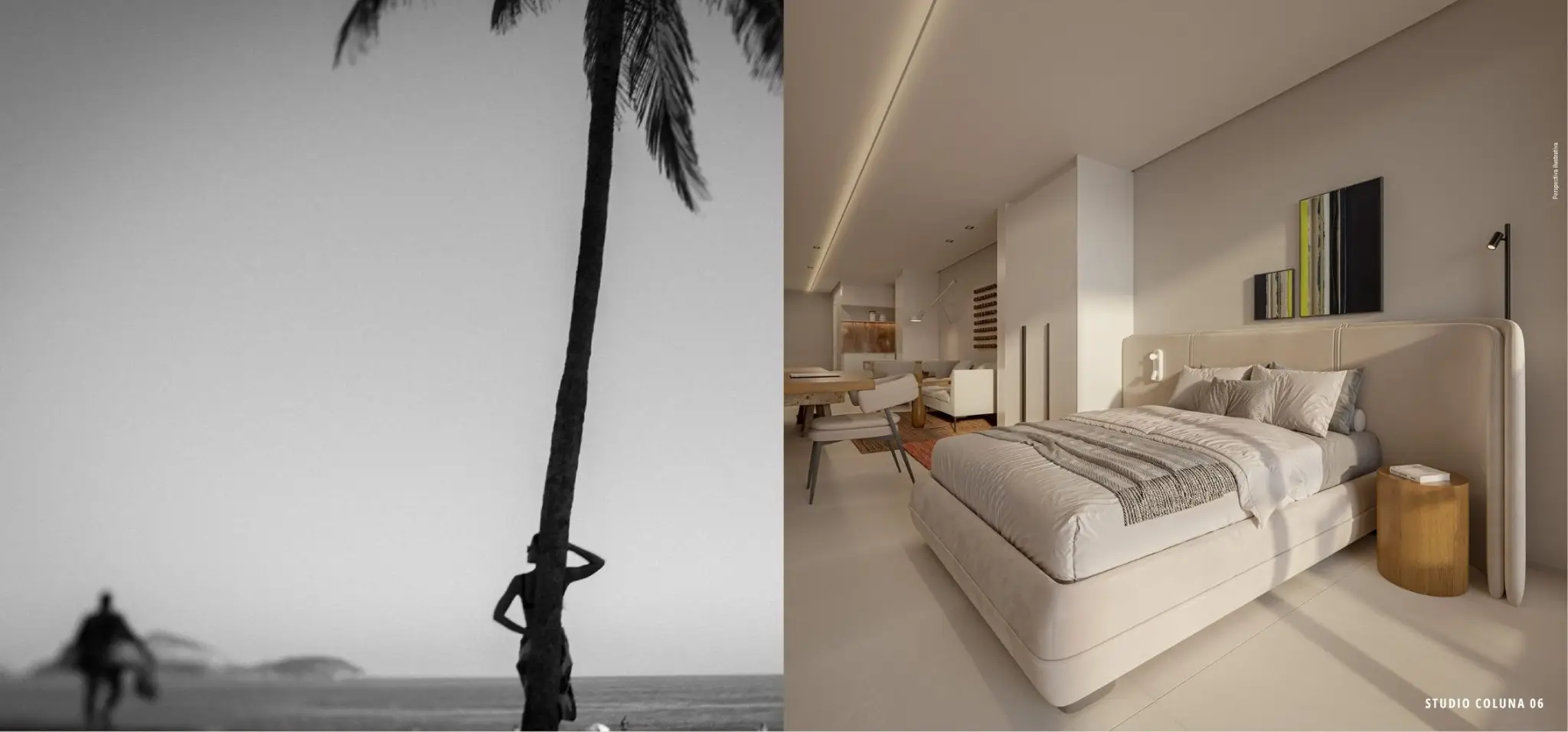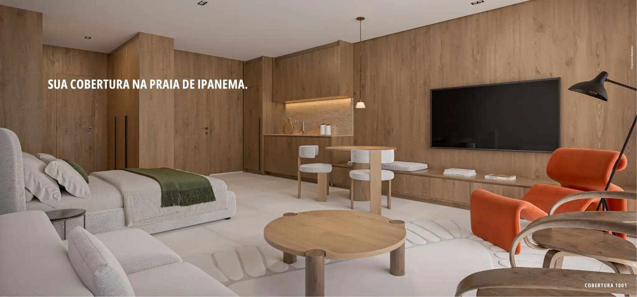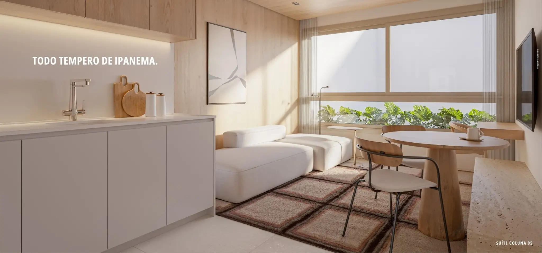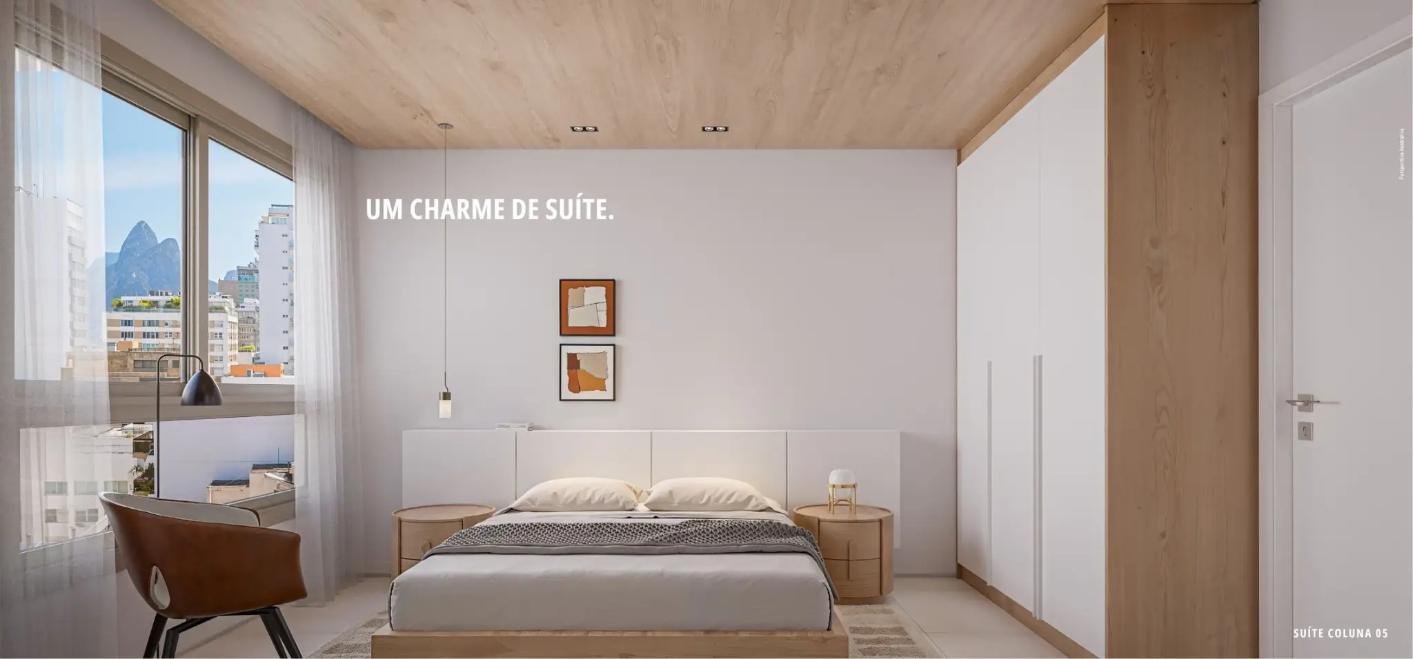 As suítes do empreendimento chegam com metragens entre 45 m² e 55 m², oferecendo mais conforto e privacidade sem perder a funcionalidade. Por isso, essa tipologia agrada tanto quem quer morar quanto quem busca um produto que entrega diária estável e ocupação forte. Além disso, a planta é limpa, prática e reforça o estilo clássico de Ipanema.