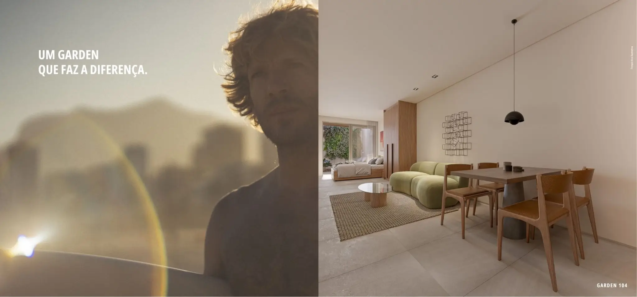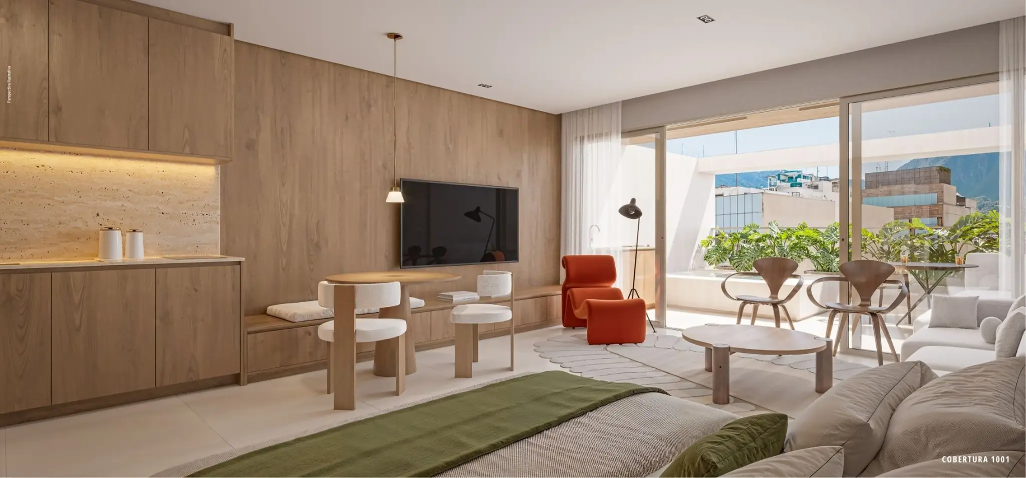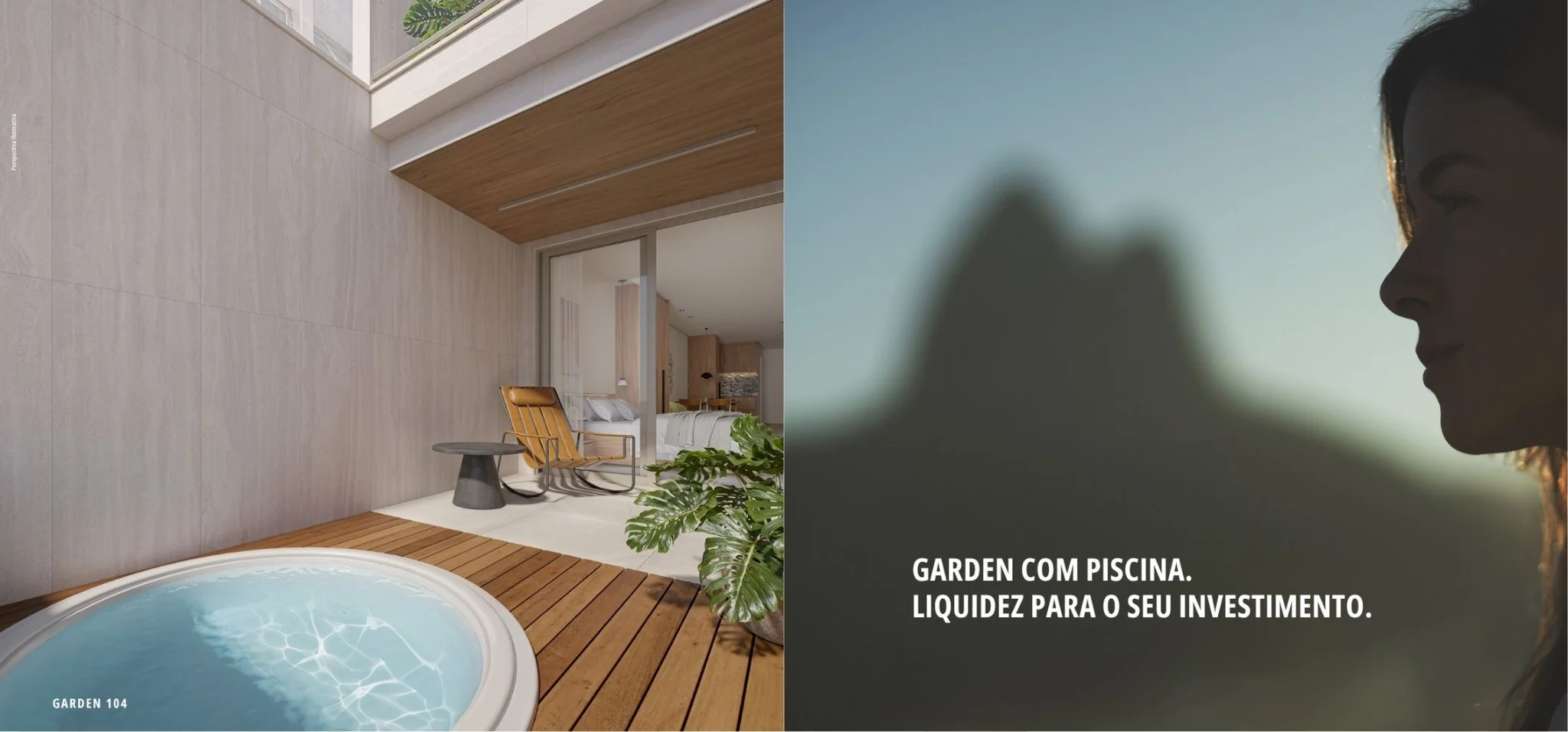 Os gardens do Sal Ipanema Stúdios têm entre 50 m² e 65 m² de área total, combinando área interna funcional com espaço externo privativo — um diferencial raro em Ipanema. Por isso, essa tipologia atende um público mais exigente e, frequentemente, gera alta procura no short stay por causa da área aberta. Em síntese, é um perfil que valoriza e se mantém forte ao longo do tempo..