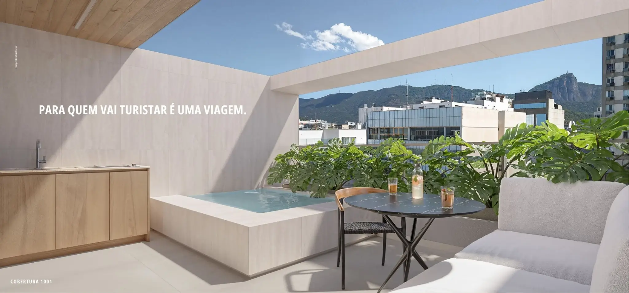 As coberturas do Sal Praia de Ipanema variam entre 60 m² e 65 m², somando área interna funcional e área externa com vista aberta. São as unidades mais valorizadas do projeto e as que têm maior potencial de diária no short stay por causa da exclusividade e da experiência premium.