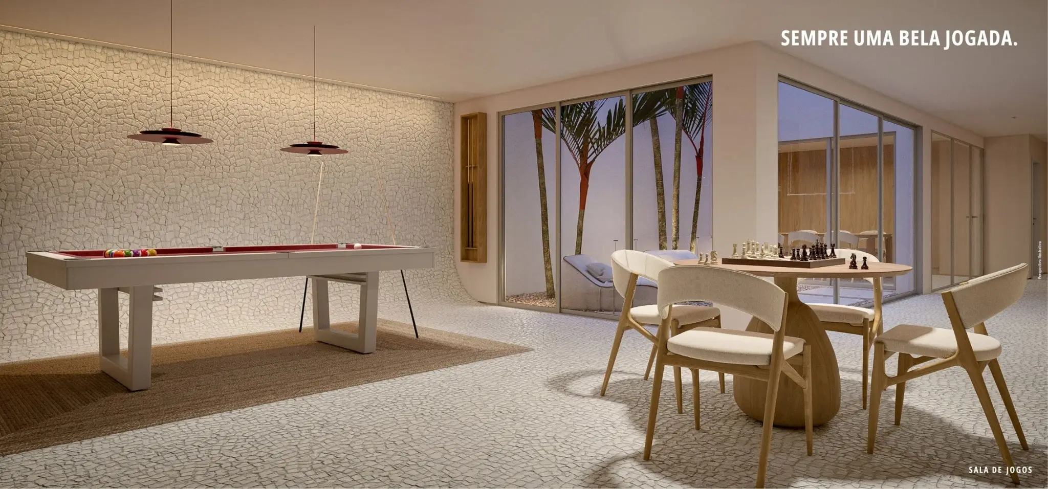 Áreas Comuns: Piscina de borda infinita, sauna, academia, sala de jogos, sala de TV, coworking, minimercado, lavanderia